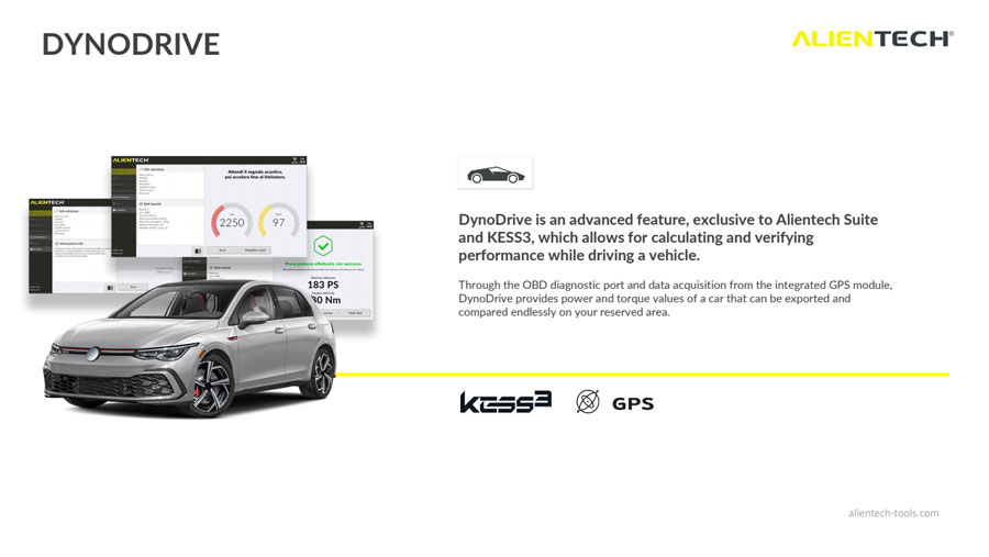 dynodrive هي فريدة من نوعها ميزة متقدمة من جناح alientech و kess3 ، مما يتيح حساب والتحقق من الأداء أثناء القيادة .من خلال منفذ OBD التشخيص وجمع البيانات من وحدة النظام العالمي لتحديد المواقع المتكاملة ،
