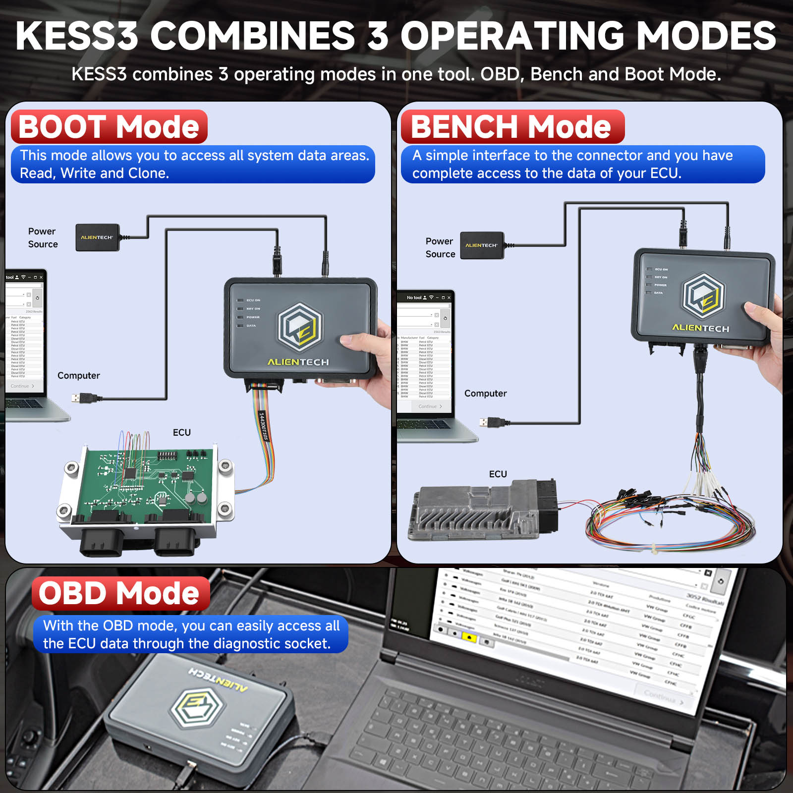 kess3 يجمع بين ثلاثة أنماط التشغيل في أداة واحدة .OBD ، طاولة العمل ، ووضع بدء التشغيل .تكوين وفقا للاحتياجات الخاصة بك والعمل . kess3 يوفر لك أفضل النتائج بغض النظر عن المستوى والخبرة في إعادة رسم الخرائط .