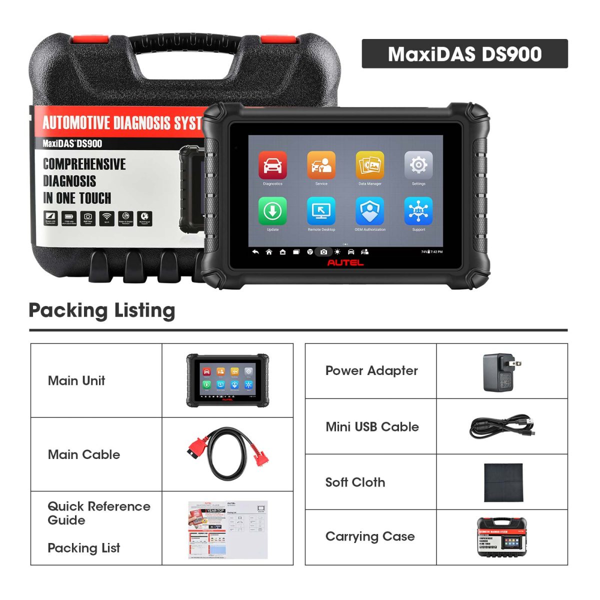 Der DS900 ist Ihre beste Wahl für alle Systemdiagnose, einschließlich Antiblockiersystem (ABS), elektronische Parkbremse (EPB), Batterie Mange System (BMS), zusätzliches Rückhaltesystem (SRS), Lenkwinkelsystem (SAS), Klimaanlage, etc.