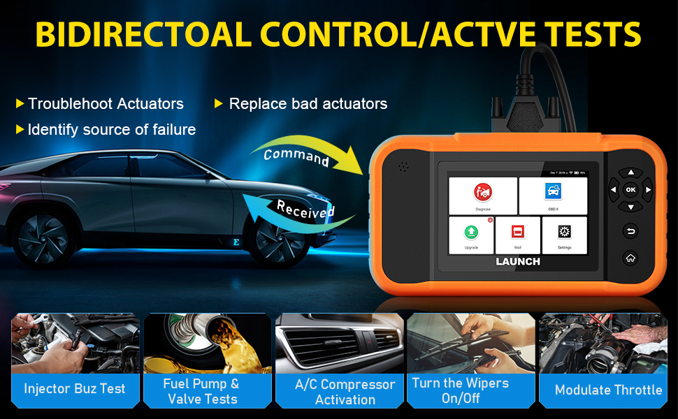 2. Leistungsstarke bidirektionale Steuerung (aktive Tests):Fordern Sie Informationen an oder befehlen Sie einen Stellantrieb, um spezifische Tests durchzuführen, z. B. das Ein-/Ausschalten der Klimaanlage, EVAP-Test, Kraftstoffpumpentest und mehr, um die spezifischen Reparaturarbeiten zu lösen.