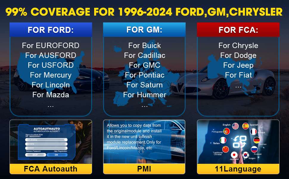 Kompatibel mit 99% Fahrzeugen von Ford, GM, Chrysler von 1996-2024, einschließlich 12V Autos, leichte Nutzfahrzeuge, SUVs, Hybridfahrzeuge, Minivans, keine IP beschränkt.