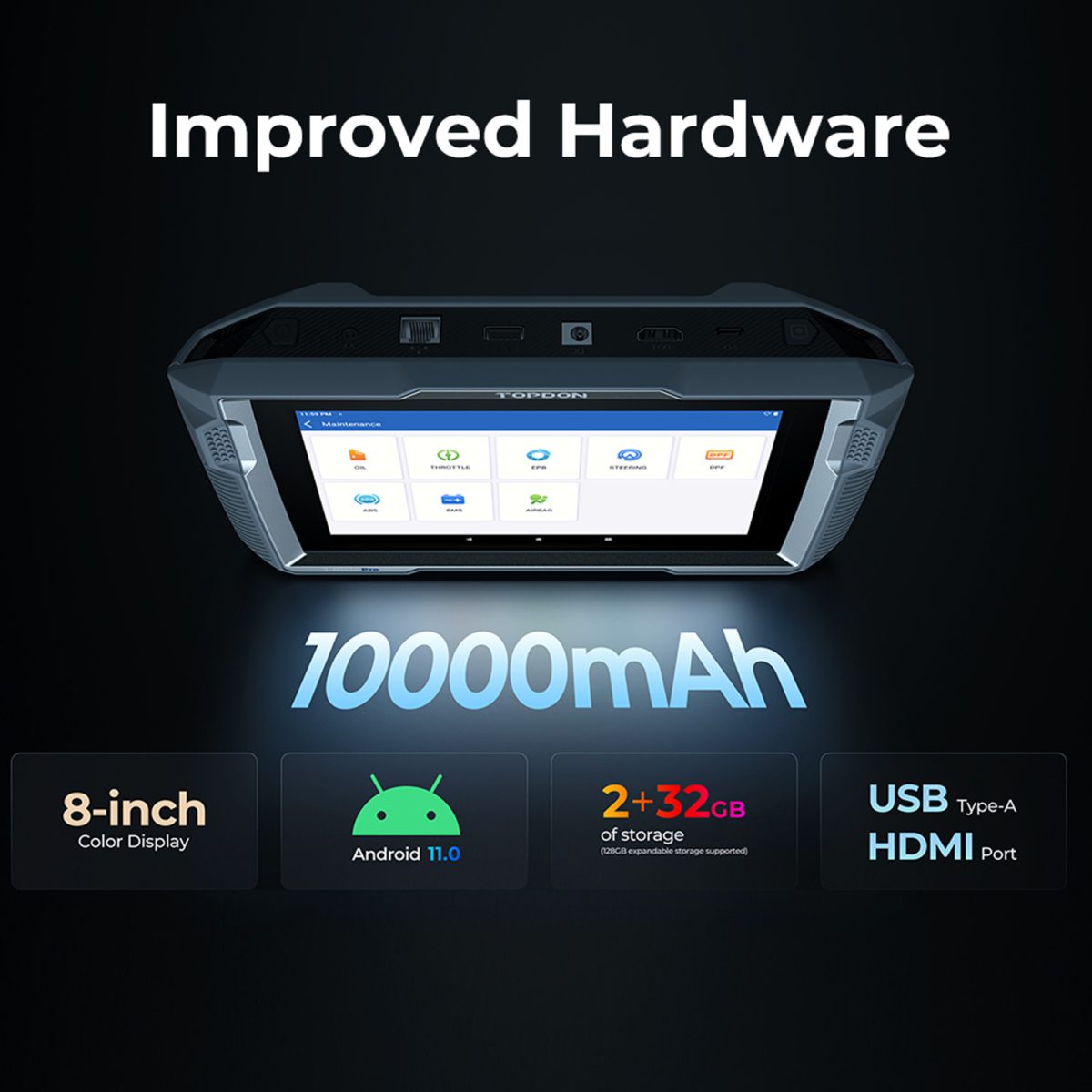 Der T-Ninja Pro verfügt über einen langlebigen 10000mAh Akku, um Techniker vor wiederholten Aufladungen während des Tages zu bewahren.Es läuft auf Android 11.0 und verfügt über einen Quad-Core A17 Prozessor, ein 8-Zoll Farbdisplay und 32GB Speicher (128GB erweiterbarer Speicher unterstützt) und bietet eine stabilere Leistung als der T-Ninja1000.Ausgestattet mit einem USB-Typ A-Anschluss können Benutzer den VCI an das Tablet anschließen, um eine zuverlässigere Datenübertragung bei der Arbeit an Wegfahrsperren zu ermöglichen.Der HDMI-Anschluss ermöglicht es Benutzern, den Diagnoseprozess zu Demonstrations- und Analysezwecken zu projizieren.