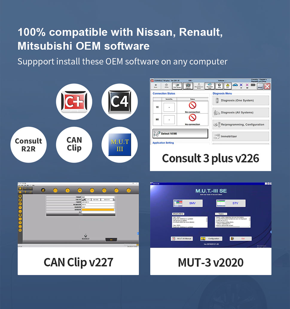 Unterstützung der Installation dieser OEM-Software auf jedem Computer: C+, C4, Consult R2R, CAN Clip, M.U.T III, Consult 3 plus v226, CAN Clip v227, MUT-3 v2020.