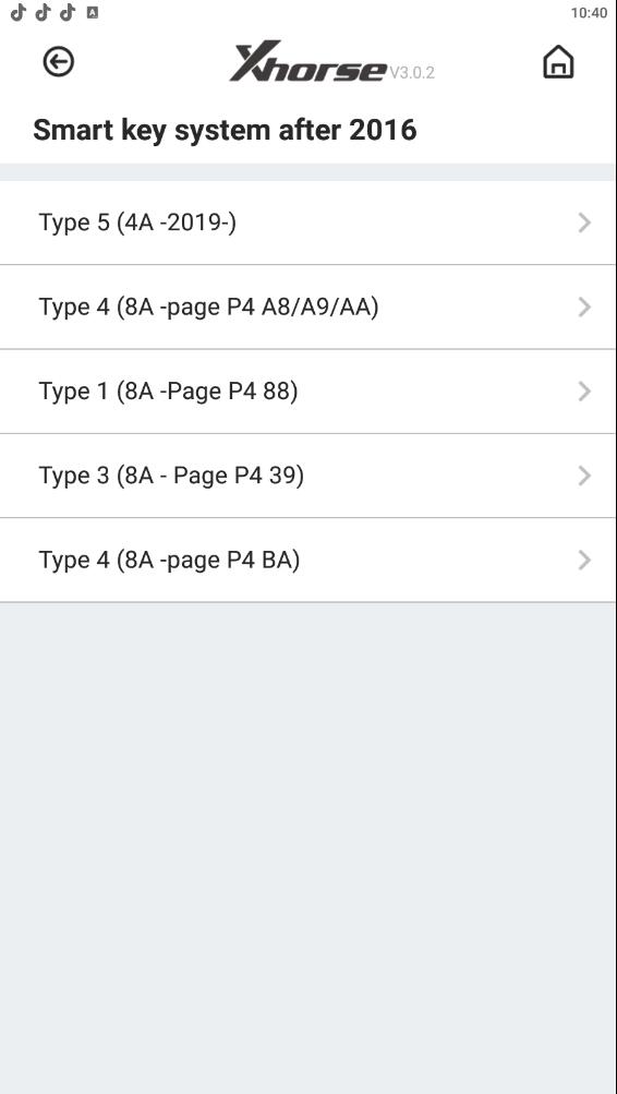 1. [Nach Modell auswählen], [Immo-System], [Remote-System], [Smart Key vor 2016], [Smart Key nach 2016]: Wählen Sie Typ für die Schlüsselprogrammierung: