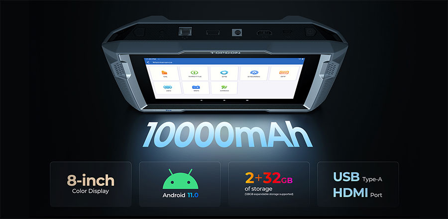 El t – Ninja pro está equipado con una batería duradera de 10.000 Mah para evitar que los técnicos recarguen repetidamente durante todo el día.Se ejecuta en Android 11.0 y cuenta con un procesador a17 de cuatro núcleos, una pantalla de color de 8 pulgadas y 32 GB de espacio de almacenamiento (128 GB de espacio de almacenamiento escalable), con un rendimiento más estable que el T – ninja1000.Equipado con un puerto USB – tipo a, el usuario puede conectar el VCI a la tableta para una transmisión de datos más confiable al usar el sistema antirrobo.El puerto HDMI permite a los usuarios proyectar el proceso de diagnóstico para su demostración y análisis.