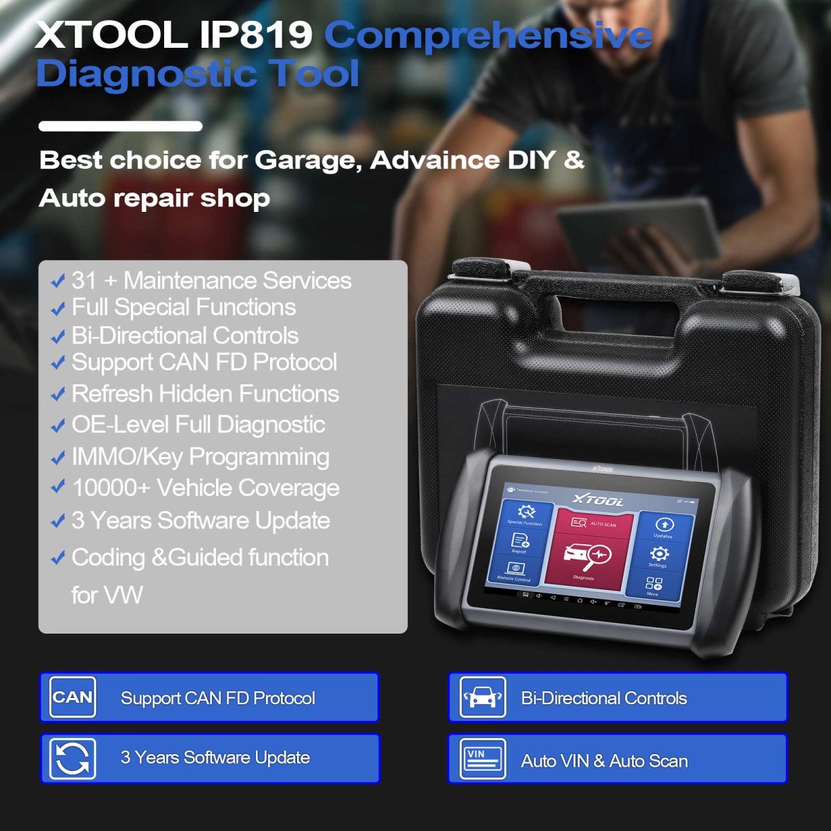 Xtool inplus ip819 es una herramienta de diagnóstico inteligente basada en el sistema operativo android.Admite conmutación multilingüe y una amplia cobertura de vehículos.Más de 30 funciones de mantenimiento, incluidas las funciones de mantenimiento más populares, como deflación abs, programación de llaves, codificación de inyectores de combustible, reinicio de aceite, epb, etc.Convirtiéndolo en una herramienta de diagnóstico automático perfecta para uso doméstico y profesional.