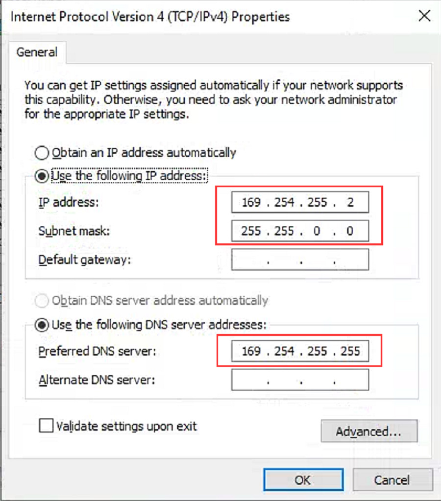 (2) connexion filaire: connectez le port USB ⑦ du boîtier matériel M6 + au port USB de l’ordinateur ou de la tablette via un câble USB, une nouvelle connexion réseau apparaîtra sur l’interface de gestion réseau de l’ordinateur ou de la tablette (win10 sans pilote), l’adresse IP de l’attribut de connexion réseau sera remplacée par 169.254.255. *,Masque de sous – réseau: 255.255.0.0, DNS préféré: 169.254.255.255, cliquez sur avancé, ajoutez plusieurs adresses IP en tant que 172.29.127. *, 255.255.0.L’indicateur ④ s’allume une fois que l’ordinateur ou la tablette est connecté au réseau.
