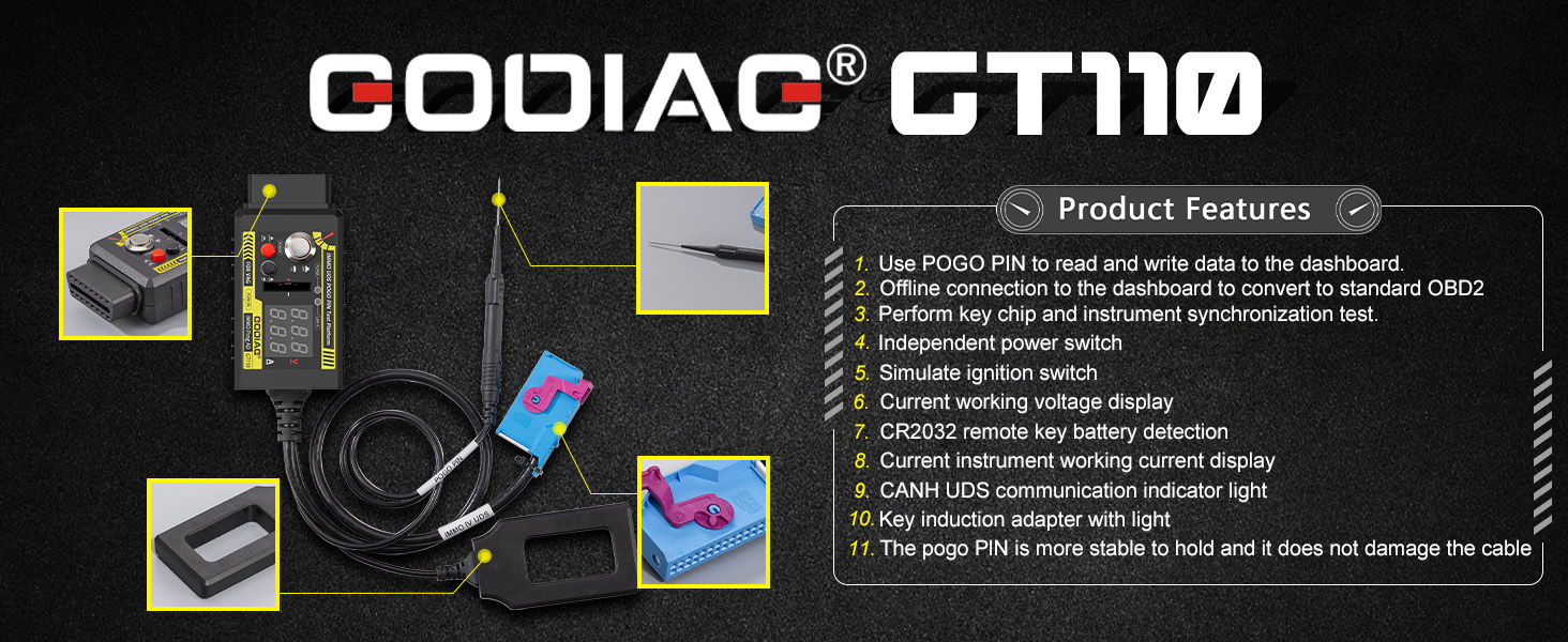 GODIAG GT110Per VW Skoda Seat CAN-Bus UDS 4th Generation IMMO System Test Platform Cable supporta VW Skoda Seat e altri modelli ed esegue offline lettura e scrittura dei dati PIN POGO.È per la programmazione delle chiavi dei cruscotti (compresa la sonda Boot).di tutti i sistemi UDS di Volkswagen, Skoda e Seat.Il prodotto può visualizzare la tensione di lavoro corrente e la corrente, ha un interruttore di alimentazione, l’interruttore di accensione di simulazione e un cicalino per sollecitare l’avvio e lo spegnimento dell’accensione.Supporta l’indicazione di comunicazione CANH UDS, il rilevamento remoto della batteria della chiave CR2032, la prova di sincronizzazione della chiave e dello strumento IMMO, il rilevamento intelligente dell’induzione dell’area di inizio di emergenza del sistema IMMO, la diagnosi offline dello strumento combinato IMMO, la lettura e la scrittura dei dati IMMO dello strumento, la riparazione del chilometraggio dello strumento, la corrispondenza chiave e altre funzioni.