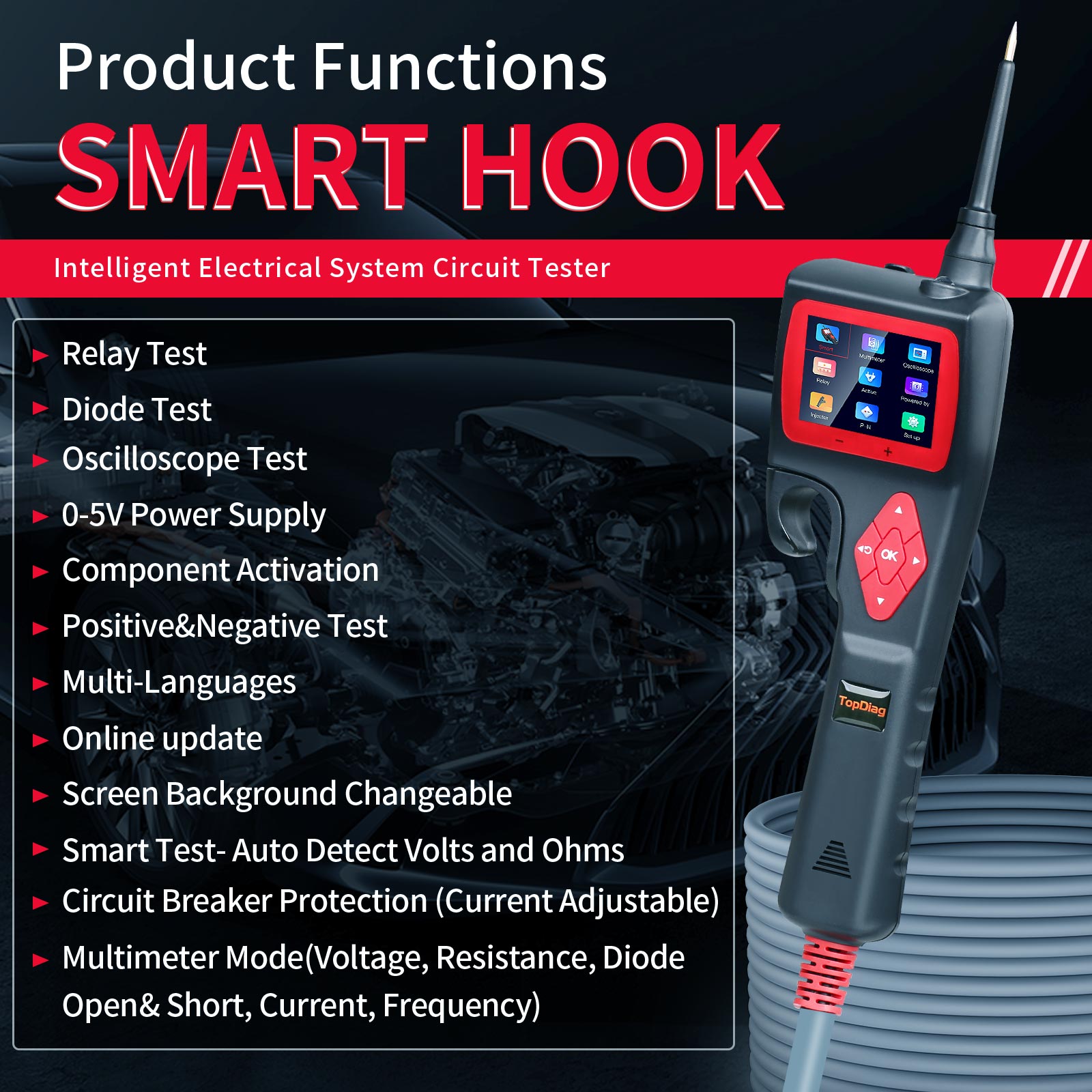 TOPDIAG P200 SMART HOOK Potente Sonda, la nuova generazione di analizzatori di circuiti intelligenti, è l’unico tester di circuito che può essere aggiornato sul mercato.Può testare tutti i sistemi elettronici 9V-30V rapidamente.Il tempo di prova può essere notevolmente abbreviato, rendendolo più conveniente, più veloce e più intelligente!