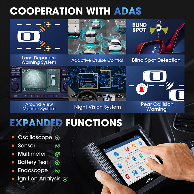 Advanced Driver Assistance System (ADAS) è un componente elettronico di un veicolo, che include varie funzioni di sicurezza del veicolo, come la frenata di emergenza automatica (AEB), l’avviso di partenza della corsia (LDW), l’assistenza al mantenimento della corsia, l’eliminazione degli angoli ciechi, la telecamera di visione notturna e l’illuminazione adattiva.(NOTA: Necessità di essere acquistato separatamente)