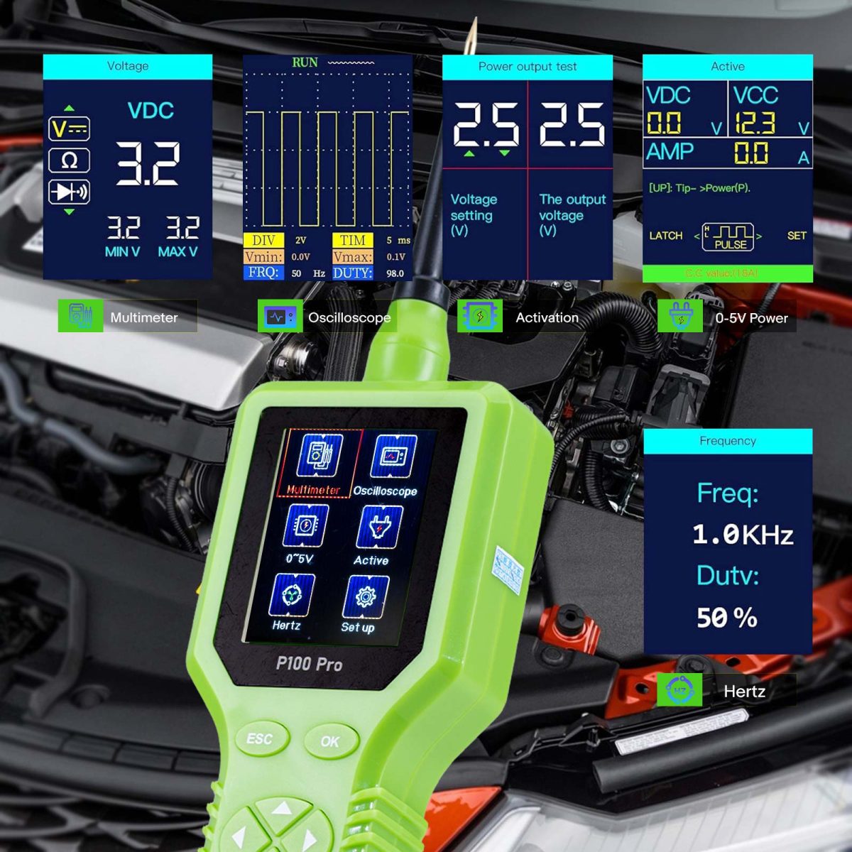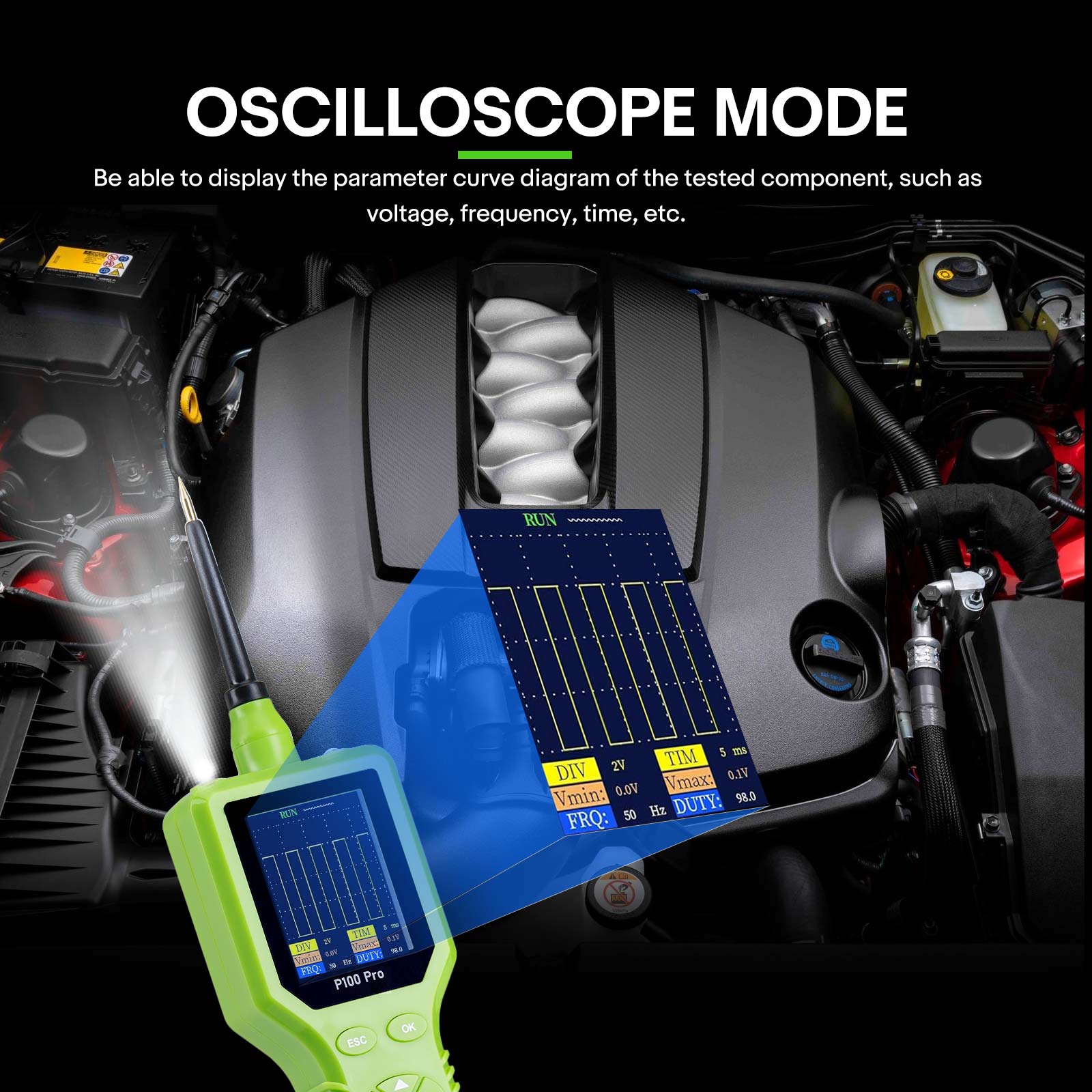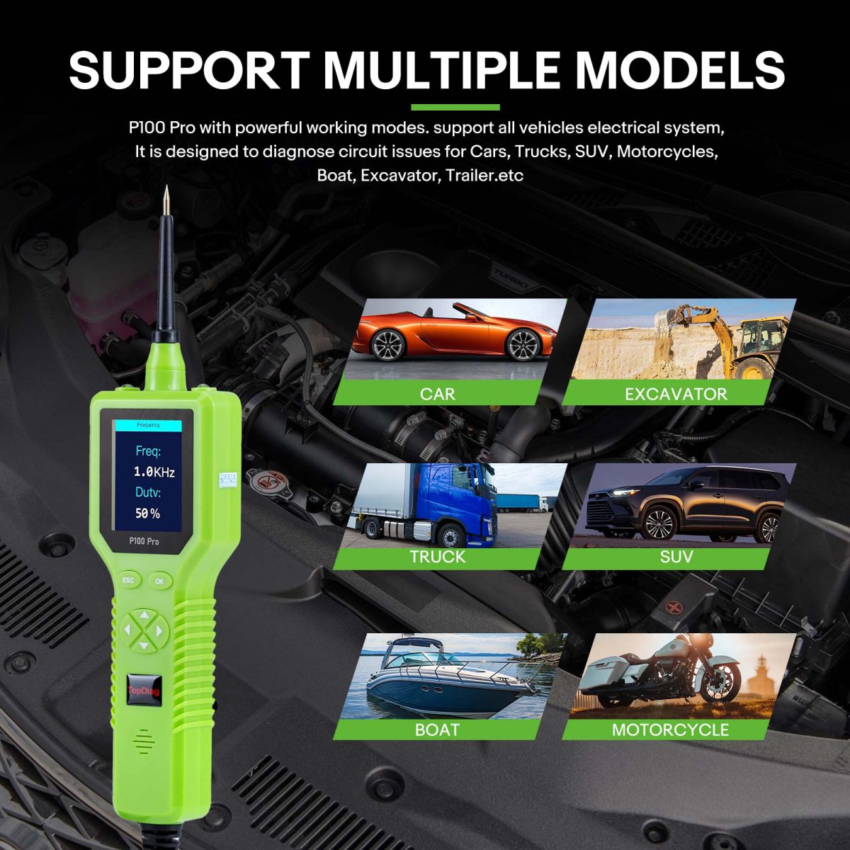 P100 Pro con potenti modalità di lavoro.Sostieni tutti i veicoli elettrici.È progettato per diagnosticare problemi di circuito per auto, camion, SUV, motocicli, barche, escavatori, rimorchi, ecc.