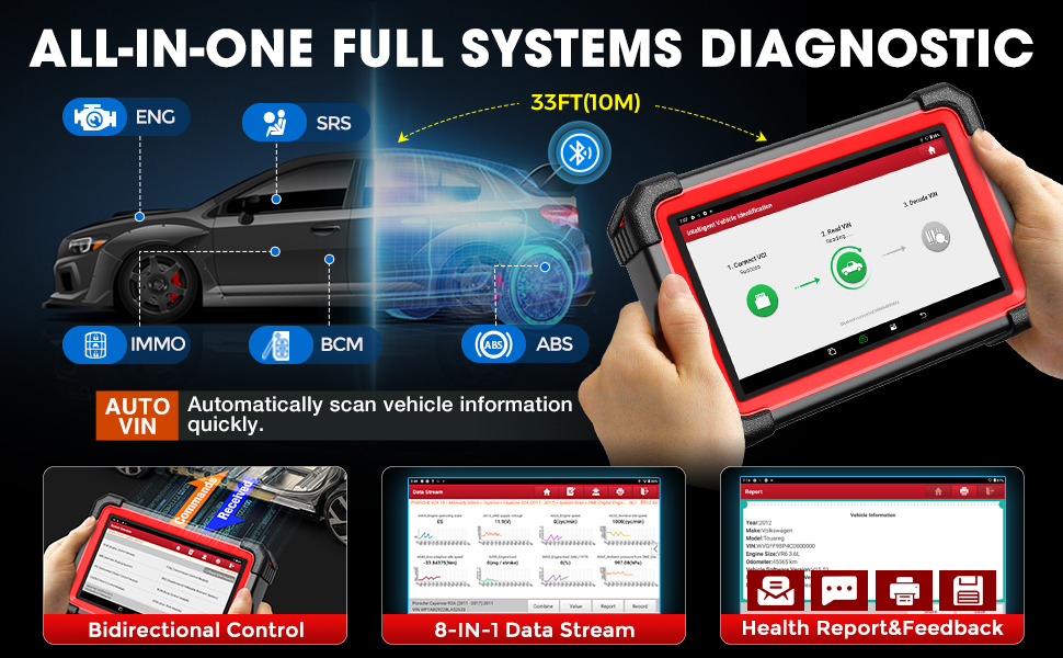 Launch CRP919EBT bidirectional scan tool adopts the latest VIN-based Auto VIN Technology that enables auto technicians or home mechanics to identify vehicle information at a single touch, like Brand, Year, Make, Model, etc. With the Auto VIN and Auto Scan feature combined, CRP919EBT can perform comprehensive diagnostics accurately and efficiently. Note: Auto VIN function can NOT work on all cars. You can always navigate your vehicle through the menu manually to perform diagnostics and services.