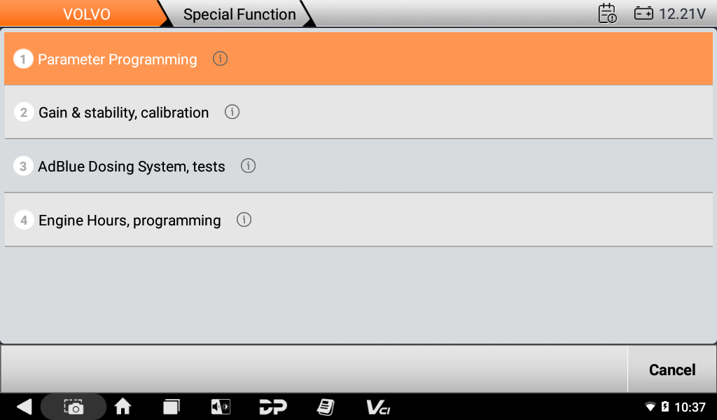 3. Support Parameter Programming, Station Configuration, Gain and Stability Calibration, ACP History test, Engine hours programming 1, Engine hours programming 2, Engine hours programming 3, Engine hours programming 4, AdBlue Dosing System tests, Engine Run-up test, Injectors shut off manual 1, Injectors shut off manual 2, Spark shut off test, Fuel pump relay test, Idle Air Control reset test, Throttle activation test, Cylinder Compression mode, Injector control test, Idle speed control test, Spark Fire test, O2 sensor test, Misfire reset test and other special functions.