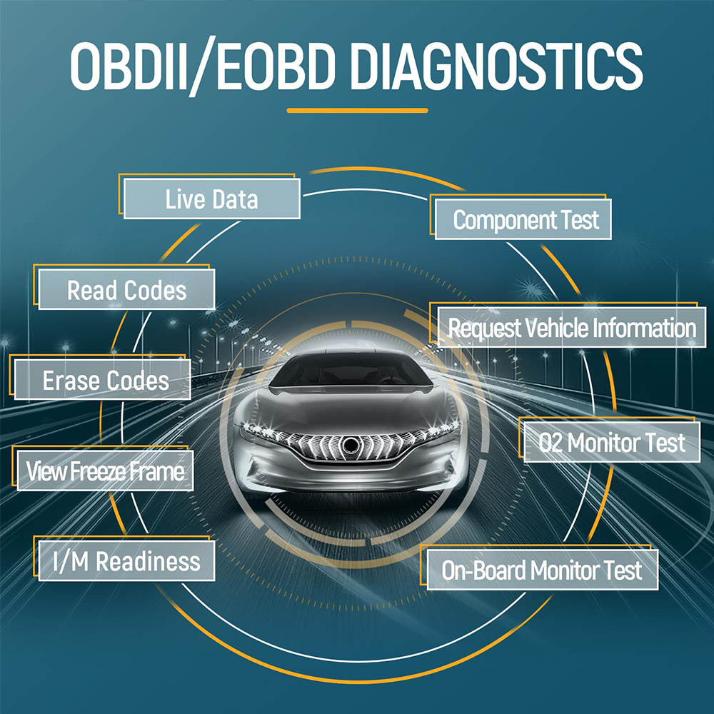 3.OBDII/EOBD+CAN機能をサポートする:コードの読み取り、コードの消去、車両情報、リアルタイムデータ、フレーム停止データの表示、I/Mレディ、酸素モニタテスト、車載モニタテスト、部品テスト、モジュールが存在する。