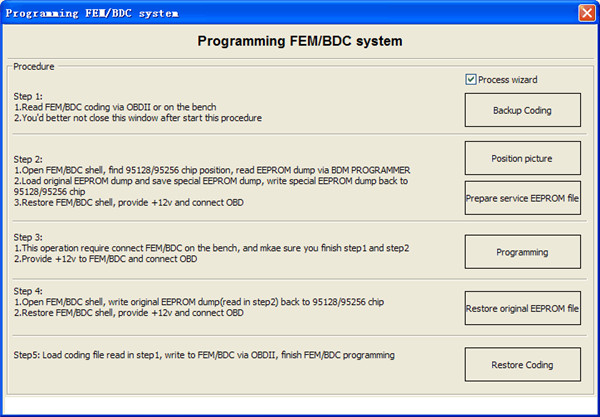 6.FEM/BDCシステムをプログラムする場合、元のeepromを復元し、符号化を復元しなければならない。エンコードを復元または復元できない場合は、FEM/BDCモジュールを自動車に組み込みますが、問題があります(例えば、リモコンが自動車を起動できない