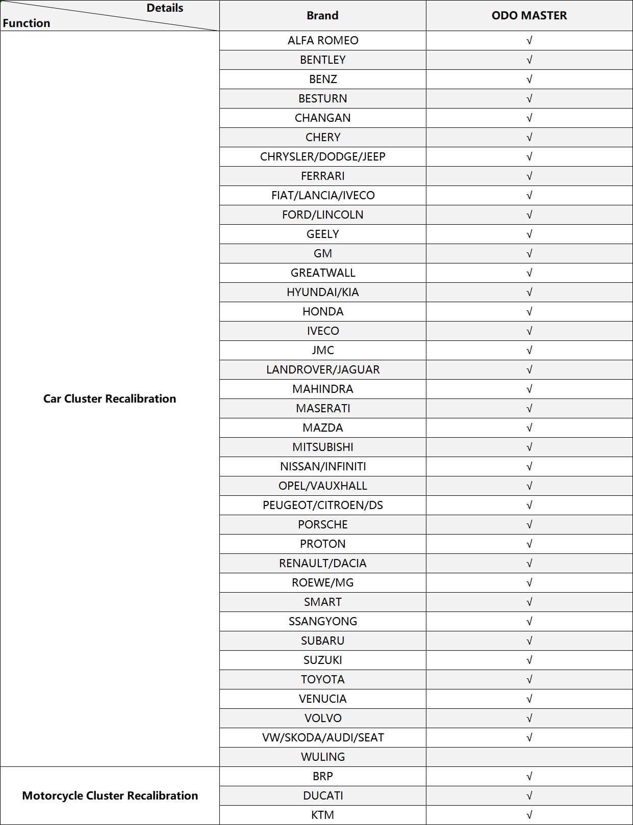 OBDSTAR ODO 기본 지원 자동차 소프트웨어 목록: