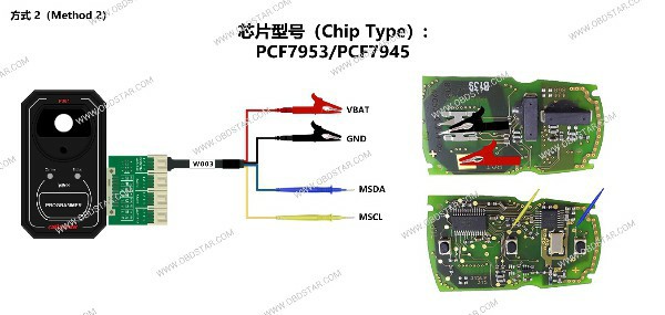 W003 데이터 케이블은 빨간색과 검은색 클립으로 양극과 음극을 고정하고 노란색과 파란색 프로브로 데이터 인터페이스에 접촉하여 데이터를 읽거나 쓸 수 있습니다.