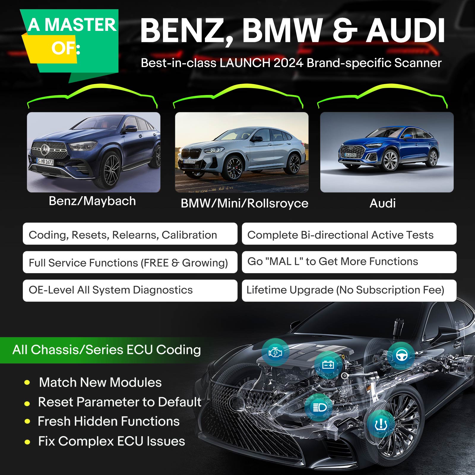 Dostęp do wszystkich dostępnych systemów:LAUNCH X431 Elite pasuje do Benz, Maybach, Sprinter, BMW, Mini, RollsRoyce, Audi, VW, Bentley, Skoda, Bugatti, Lamborghini, SEAT, Volkswagen Commercial, tak samo jak LAUNCH X431 Series.Dostępne systemy mogą obejmować: ECM (silnik), TCM (moduł sterowania skrzynią biegów), ABS, SRS (poduszka powietrzna), układ hamulcowy, BCM, ASDM (Active Safety Domain Master) BBS (akumulatorowy dźwięk głośnikowy), EPS (Eletronic Power Steering), SWM (moduł kierownicy), HVAC (ogrzewanie, wentylacja i klimatyzacja A.ir), TPMS (reset systemu monitorowania ciśnienia opon),AUD (moduł audio), EPB itp.
