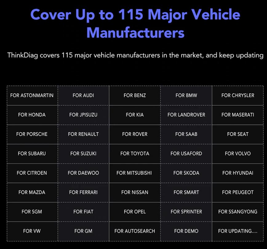6. Pokryj do 115 Głównych producentów pojazdów: ThinkDiag obejmuje 115 głównych producentów pojazdów na rynku i aktualizuj się