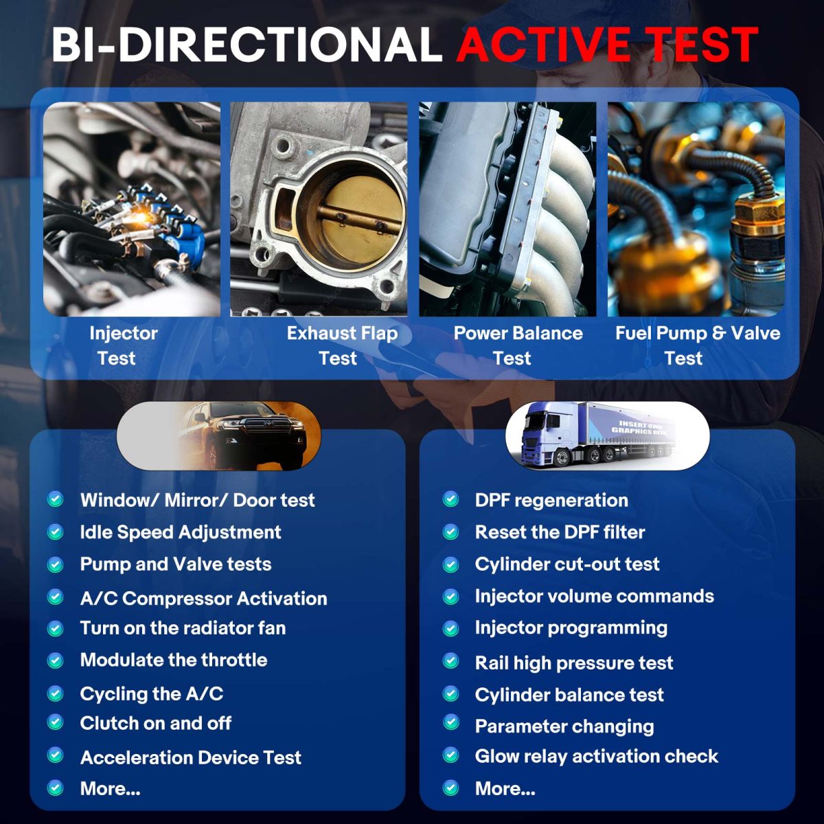 –Dla ciężkich ciężarówek ciężarowych: test wycięcia cylindrów/test ściskania/polecenia objętości wtryskiwacza/programowanie wtryskiwacza/polecenia S.CR/test wysokiego ciśnienia szyny/S.CR katalizator regeneracja/test bilansu cylindrów/D.PF regeneracje/VGT kalibracje/S.CR polecenia/reset obróbki po obróbce/zmiana parametrów/aktywacja przekaźnika pożarowego sprawdzenie/reset filtra D.P.F,itp. (różnią się w zależności od modelu samochodu, roku)