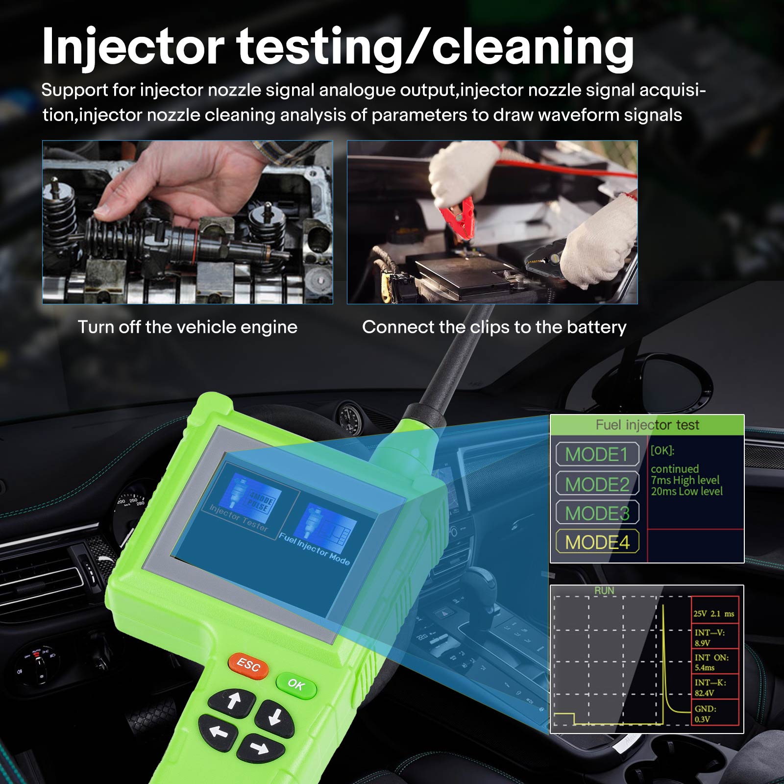 Wsparcie analogowego wyjścia sygnału dyszy wtryskiwacza, akwizycja sygnału dyszy wtryskiwacza, czyszczenie dyszy wtryskiwacza, analiza parametrów do rysowania sygnałów falowych.