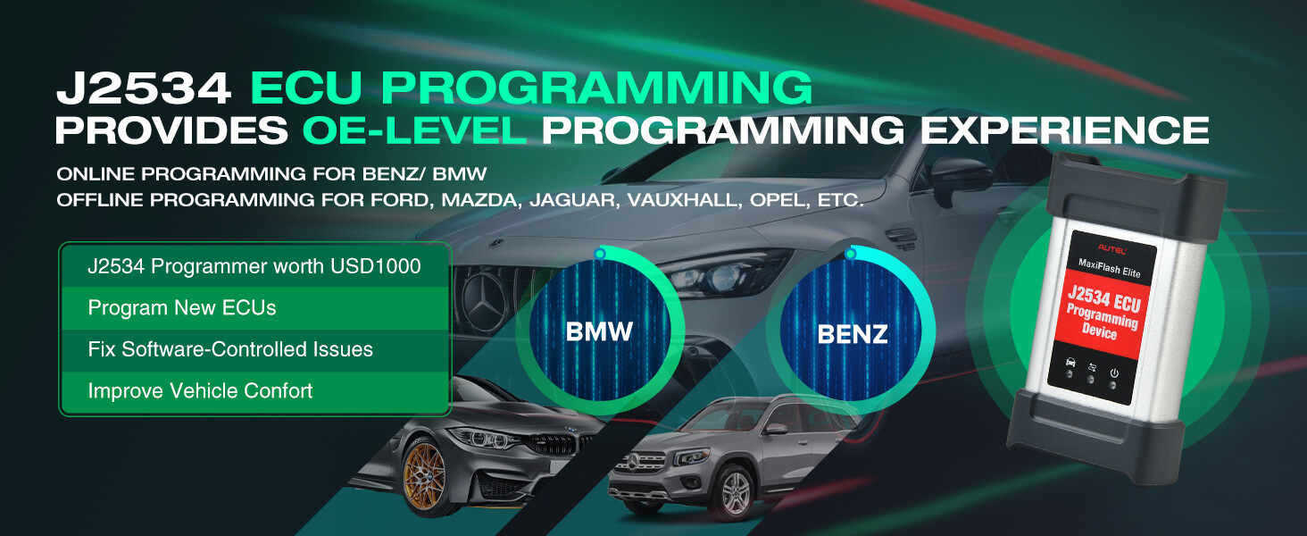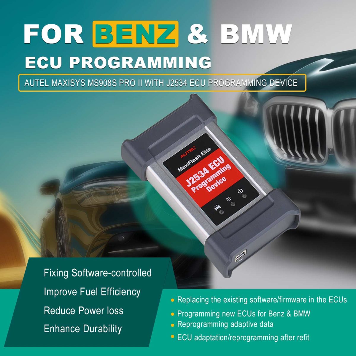 2. Programação do ECU J2534 para BMW/Benz:Equipado com o programador J2534 avaliado mais de 1000 dólares, Autel scanner MS908S Pro II é capaz de substituir o software e firmware existentes e programar ECUs novos (PCM, ECM) para carros específicos BMW e Benz.