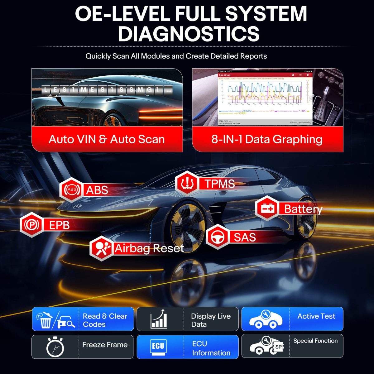 Você pode facilmente obter as informações do VIN do carro, e fazer uma varredura completa para o seu carro e obter um relatório de saúde diagnóstico.Ele fornece diagnósticos completos do sistema para uma ampla gama de sistemas do veículo, incluindo ECM, TCM, ABS, SRS, BCM e muito mais.Esse recurso permite que ele execute tarefas como leitura e exclusão de códigos, visualização de dados ao vivo e recuperação de informações ECU em vários sistemas.Os modelos de carro da gama completa e o diagnóstico completo do sistema do carro tornam-no uma ferramenta de diagnóstico automotivo profissional.
