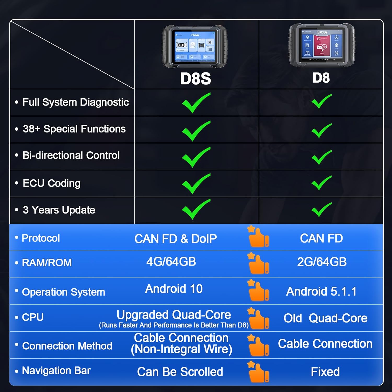 Quais são as atualizações do D8S em comparação com D8 e D7S?