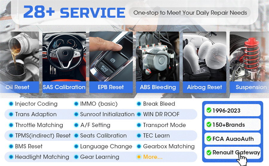 เพื่อตอบสนองความต้องการในการซ่อมแซมสูงสุดของเจ้าของร้านซ่อมรถยนต์ / ช่างเทคนิค / ช่างเครื่อง Autel เสนอบริการพิเศษระดับ 28 + OE สำหรับเครื่องสแกนเนอร์ MK808S-TS ซึ่งครอบคลุม 90% ของรถยนต์ในตลาดคุณลักษณะนี้แก้ปัญหาความยากลำบากของเครื่องสแกนวินิจฉัยอื่น ๆ เช่นฟังก์ชั่นการรีเซ็ตน้อยลงความลึกของบริการตื้นและความเข้ากันได้ที่ไม่ดีสำหรับสาเหตุพื้นฐานอุปกรณ์วินิจฉัยสากลหนึ่งเครื่อง MK808S-TS ช่วยให้คุณสามารถให้บริการแบบเดียวกันกับสแกนเนอร์วินิจฉัย OE หลายเครื่องนี่คือบริการพิเศษบางอย่างสำหรับการอ้างอิงของคุณ: