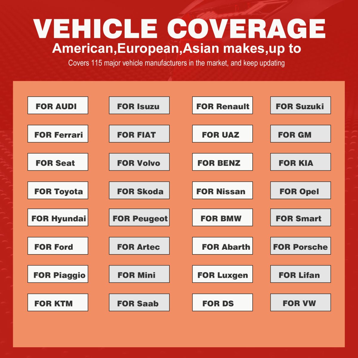 6. ครอบคลุม 115 ผู้ผลิตรถยนต์รายใหญ่: EDIAG ครอบคลุม 115 ผู้ผลิตรถยนต์รายใหญ่ในตลาดและมีการปรับปรุงอย่างต่อเนื่อง